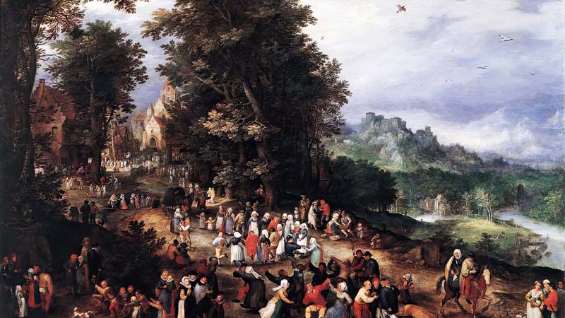 Brueghel, known as “Velvet Brueghel,” paints a panoramic view of a lively Flemish festival. His meticulous technique captures tiny figures, architecture, and landscape details with jewel-like precision. These fair scenes combine a festive atmosphere with moral or anecdotal undertones characteristic of Netherlandish painting.