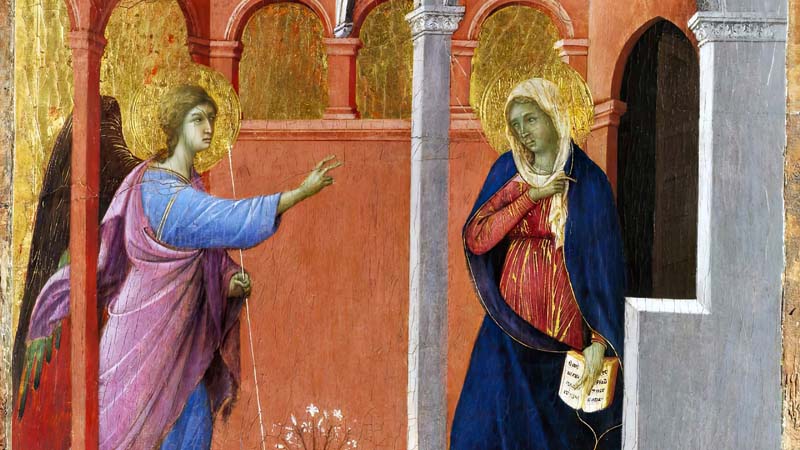Duccio’s larger Annunciation scene places the angel and Virgin in a delicately rendered architectural setting. His use of subtle gestures and eye contact underscores the moment’s spiritual gravity while demonstrating Gothic elegance.