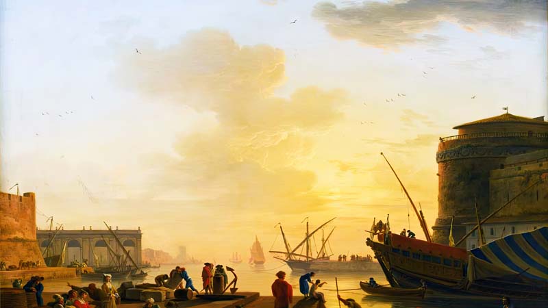 This evening scene features a tranquil harbor or coastal landscape bathed in warm twilight. Vernet’s subtle transitions of color and light demonstrate the Rococo-to-Neoclassical shift in 18th-century French landscape painting.