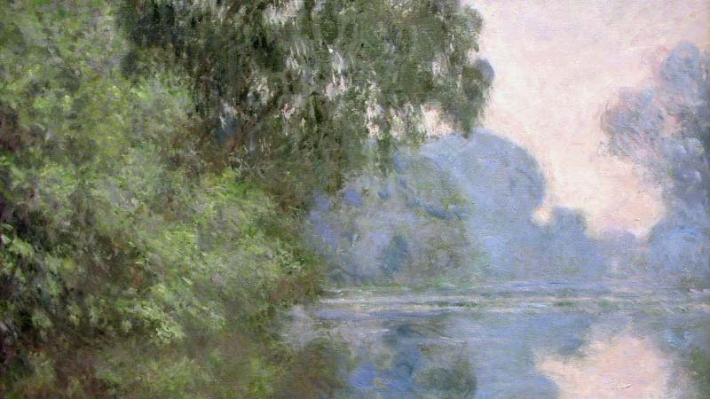 Monet’s atmospheric depiction of early morning mist on the Seine features delicate tonal shifts and soft reflections. This series underscores his pursuit of painting the same motif under varied light and weather conditions.