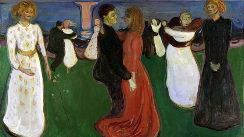 Munch’s “The Dance of Life” represents the stages of a woman’s existence, set against a shoreline. His swirling lines and bold colors highlight existential themes of youth, love, and death, central to his broader oeuvre.