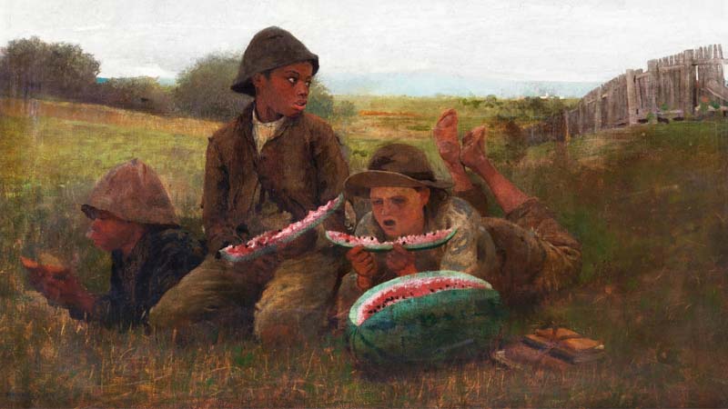Winslow Homer’s depiction of young boys with watermelons reflects his interest in rural American life. He uses lively brushwork and direct observation, capturing the spontaneity and optimism often seen in post–Civil War American art.