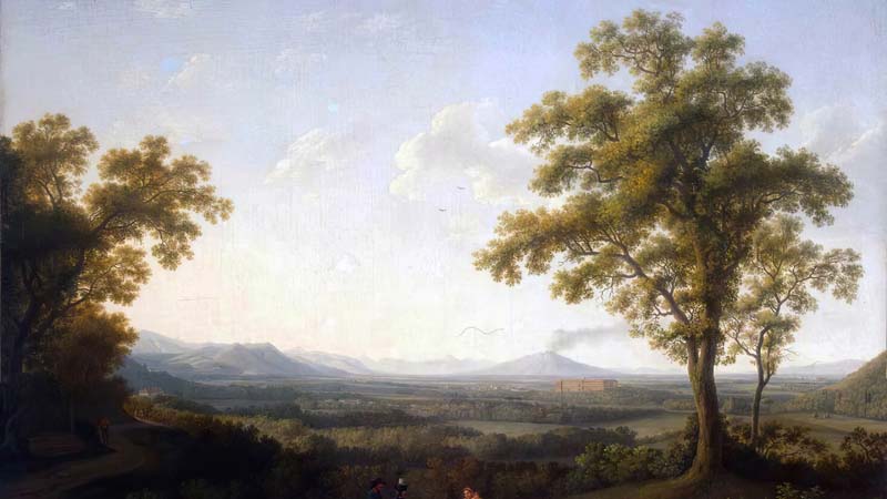 This painting features the Royal Palace of Caserta or its surroundings, highlighting grand architecture and cultivated grounds. Hackert’s precise observation and gentle atmospheric effects suit the Enlightenment fascination with regal estates.
