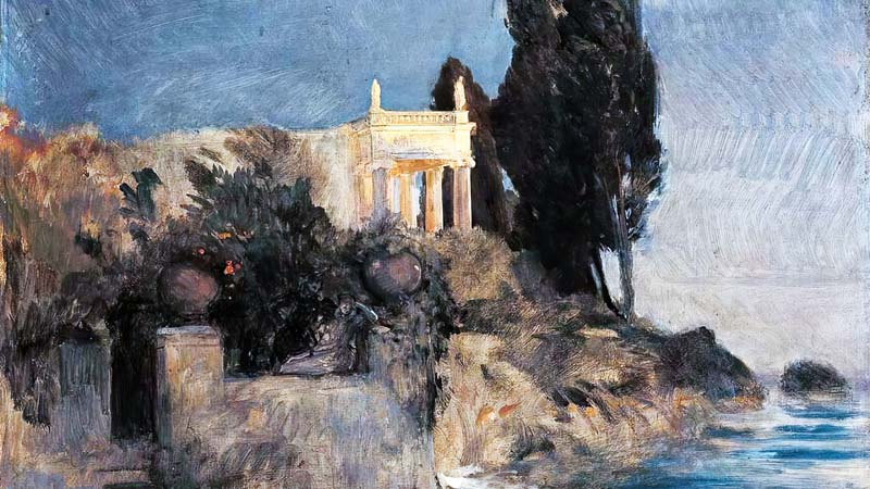 Böcklin presents a tranquil yet eerie villa overlooking a calm ocean. The painting’s melancholic atmosphere and evocative setting demonstrate his Symbolist inclination to imbue landscapes with emotional resonance.