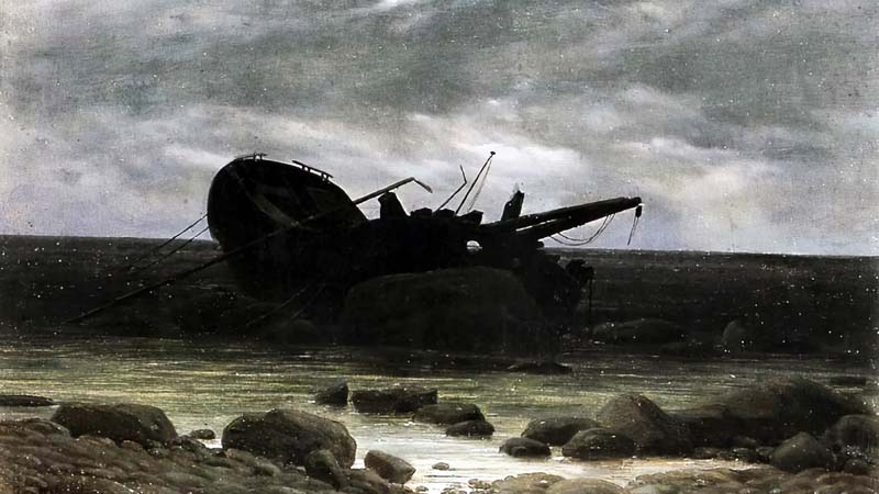 This nocturnal scene highlights a shipwreck under the moon’s glow. Friedrich contrasts the tragedy of the wreck with the serene beauty of moonlight, illustrating his fascination with mortality and the infinite.