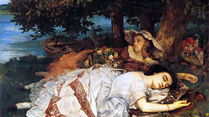 This controversial painting shows women relaxing on the riverbank in contemporary dress, challenging traditional moral codes. Courbet’s frank depiction of modern leisure scandalized conservative critics, solidifying his role as a Realist provocateur.